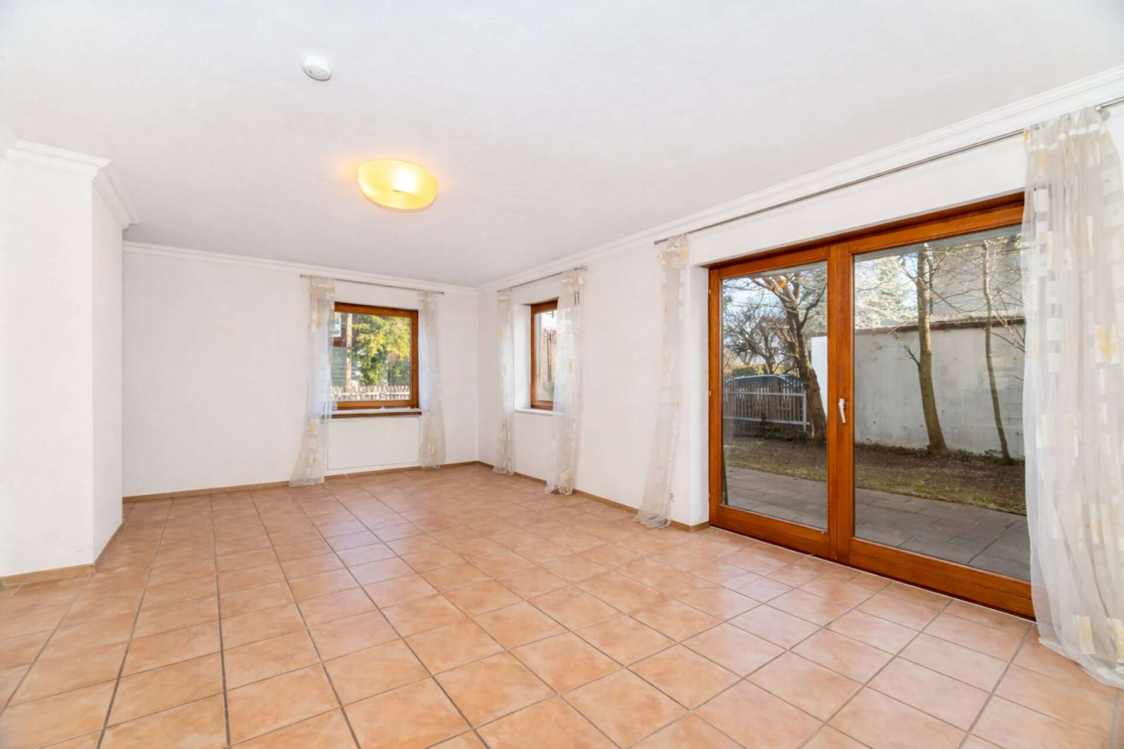 Fenster: Holzfenster, große Terrassentüranlage zum Garten sowie Balkontür