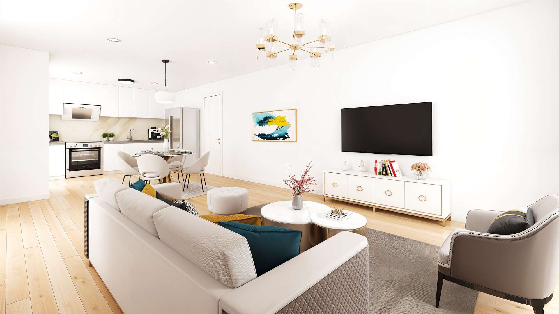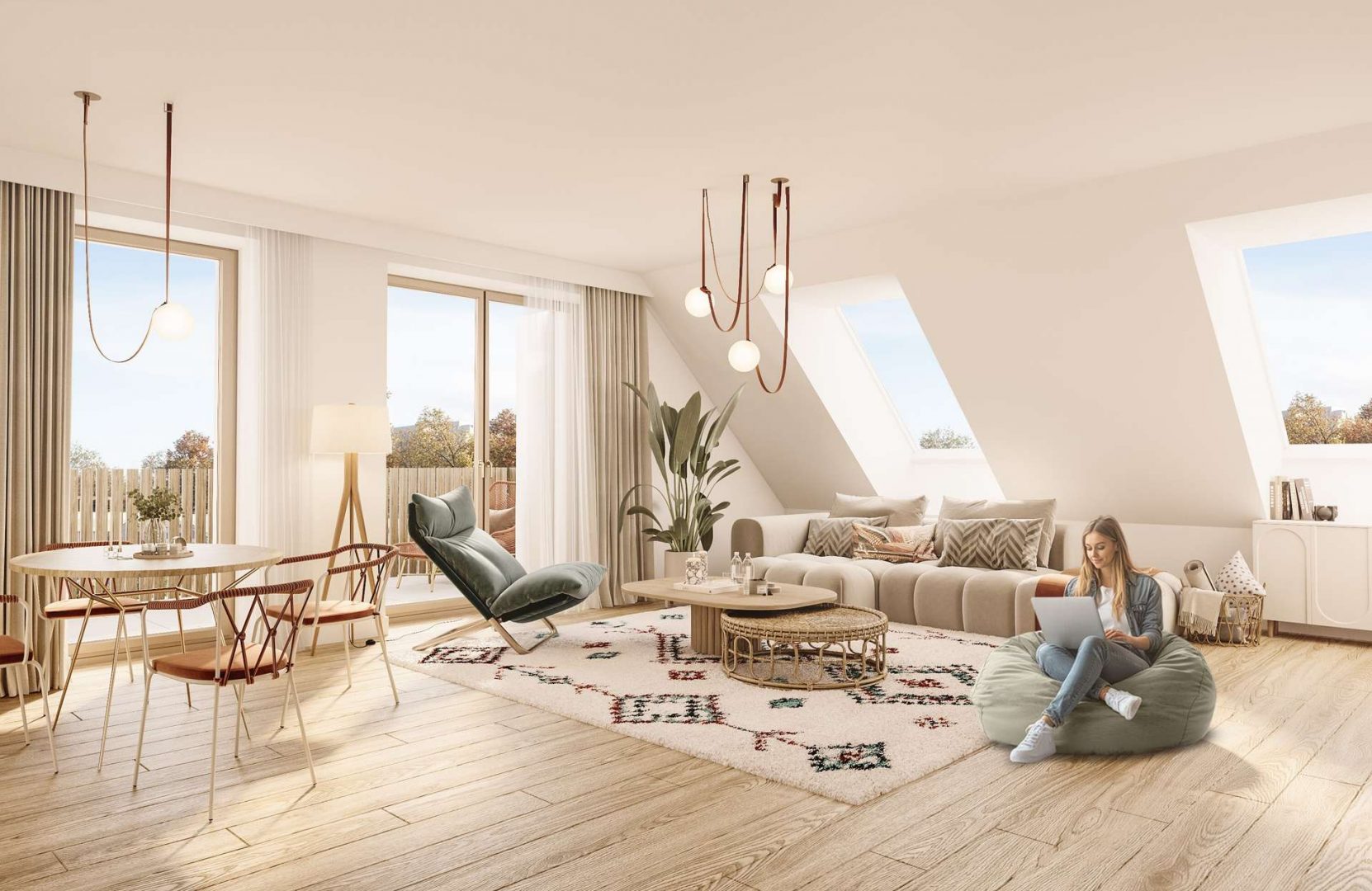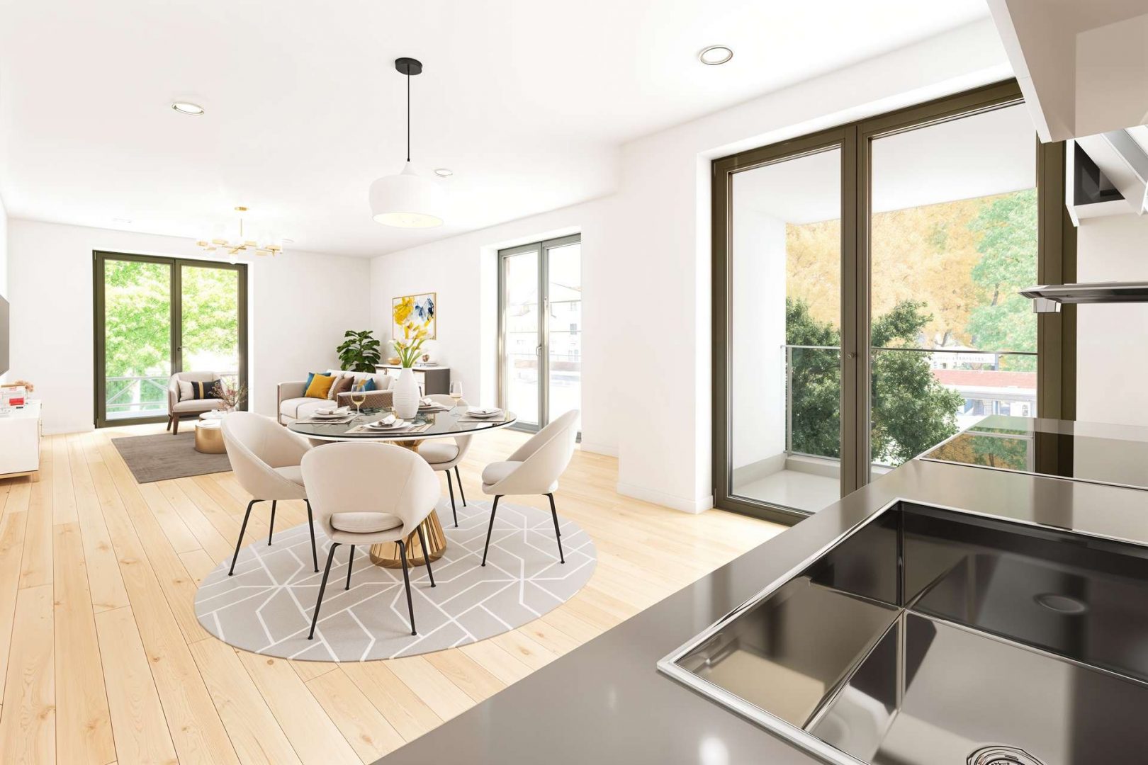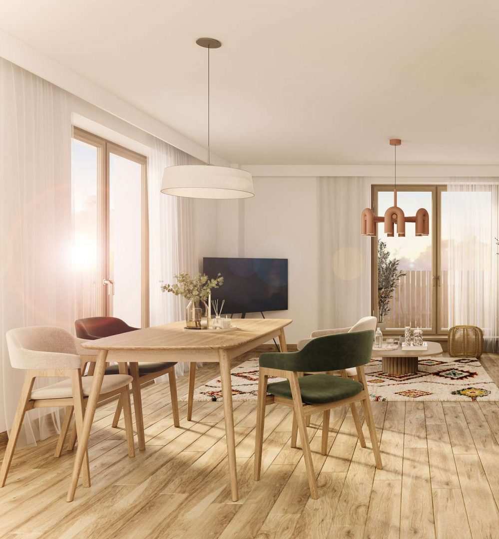 Der Herzstück der Wohnung ist der überaus großzügige Wohn-, Koch- und Essbereich, der mit Zugang zur sonnigen Süd-Loggia und einem Balkon einlädt. Hier finden bis zu 6 Personen bequem Platz zum Speisen und Zusammenkommen. Die großzügige Sofa- und Mediaecke lädt zum Entspannen und Genießen ein, während Sie die Sonnenstrahlen einfangen und den Blick in die grüne Umgebung genießen können. Willkommen in Ihrem neuen Zuhause, wo Komfort und Gemütlichkeit aufeinandertreffen."