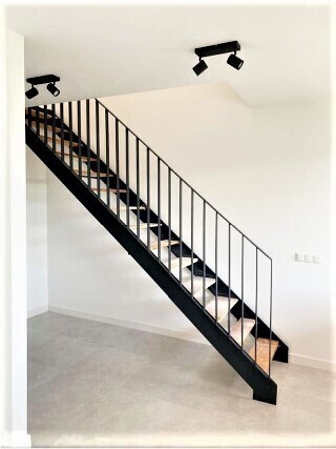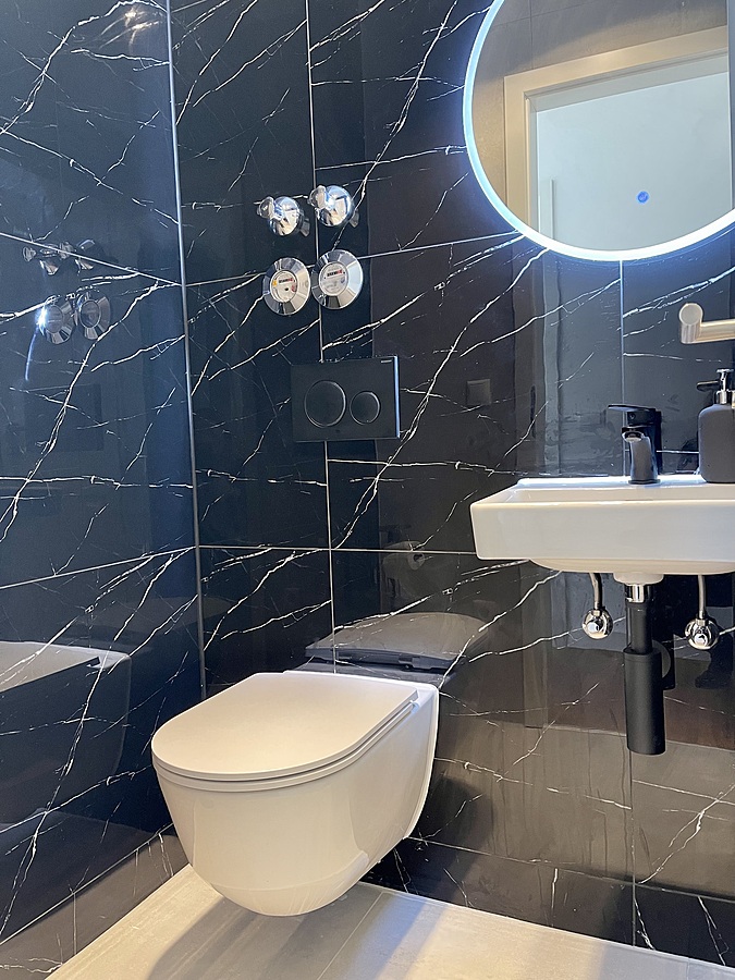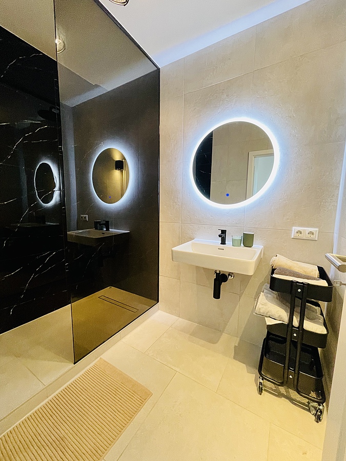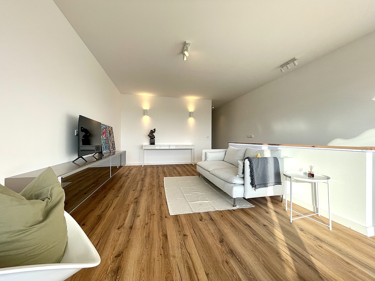 Im oberen Stockwerk liegt der helle Wohnbereich, das großzügige Schlafzimmer, die separate Toilette und ein modernes Bad mit bodengleicher Dusche und hochwertiger Ausstattung.