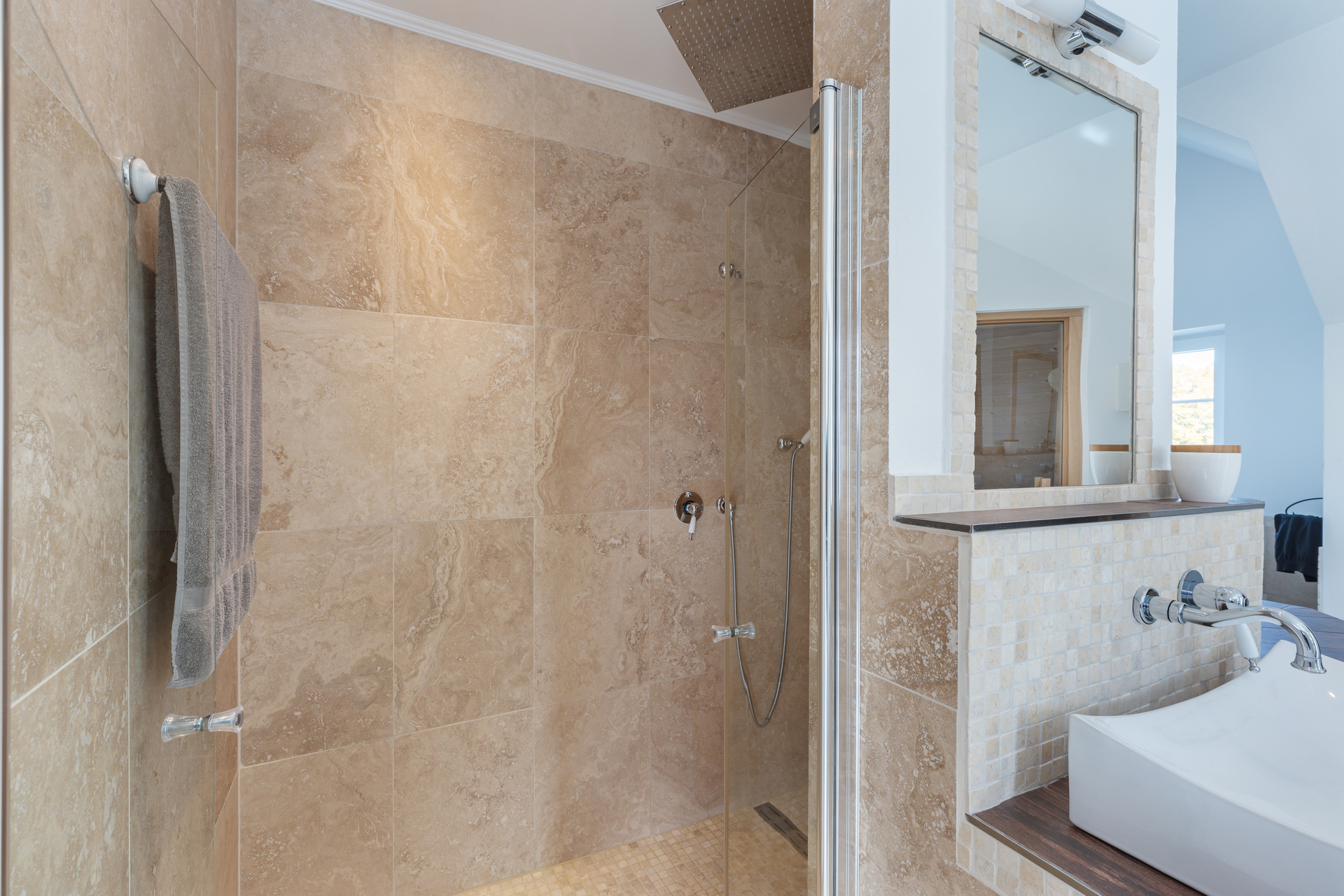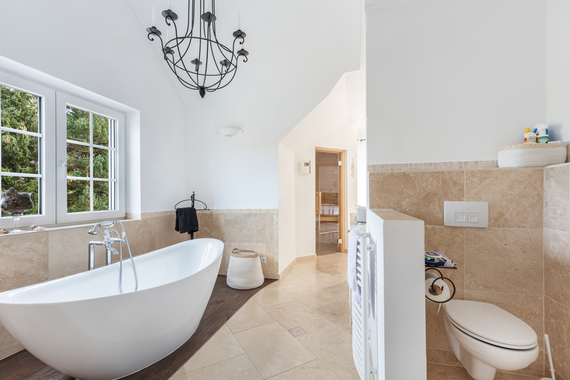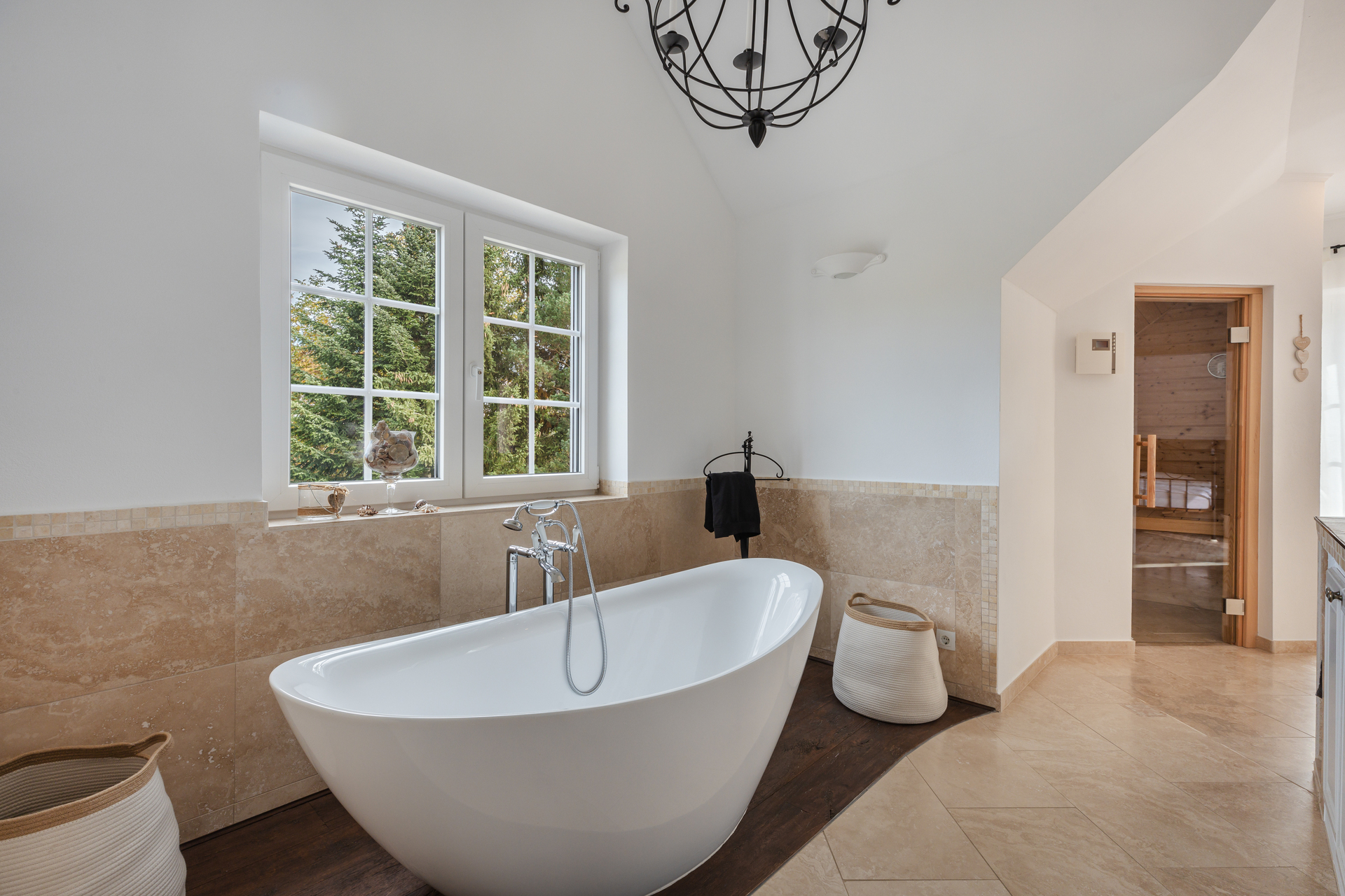 bodengleicher Regendusche, Sauna, freistehender Badewanne und Soundsystem.