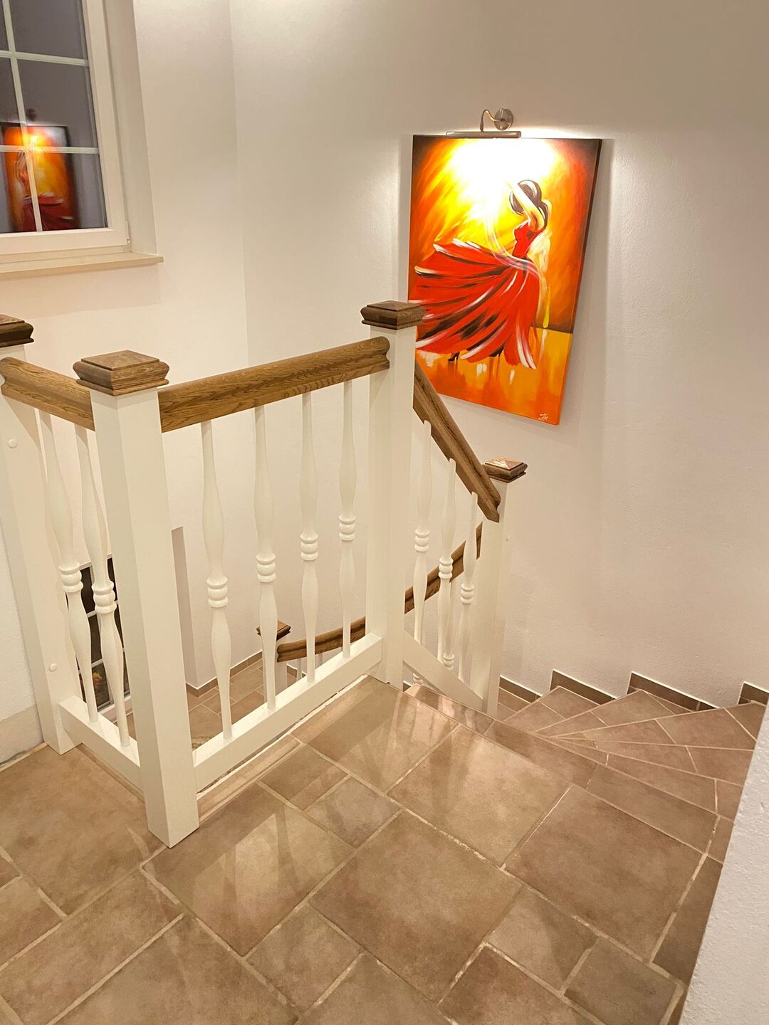 Über eine breite Treppe mit Holzbelag ist das Obergeschoss erreichbar. Hier befinden