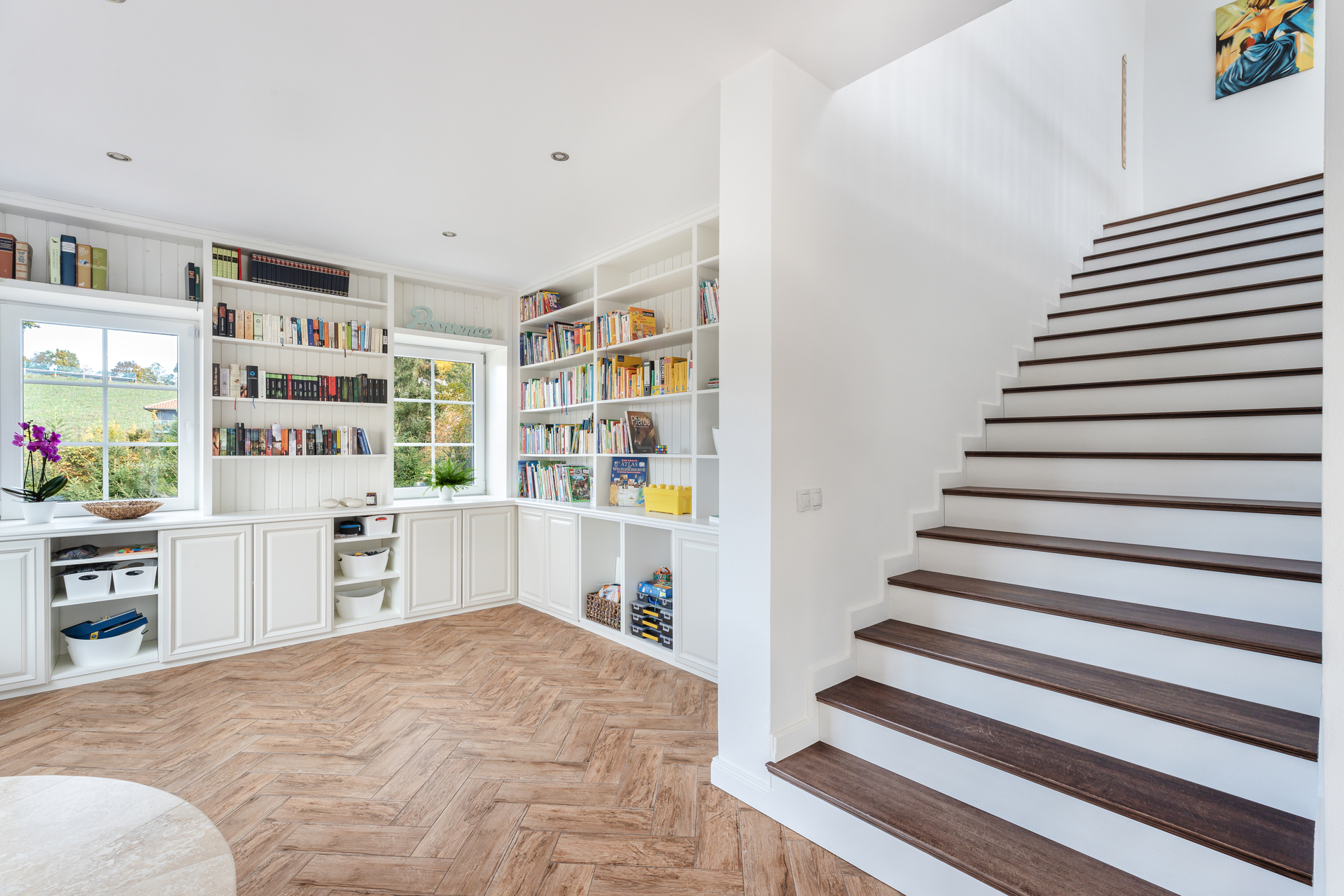 - Fischgrät-Boden in Küche, Wintergarten, Wohnzimmer und Bibliothek