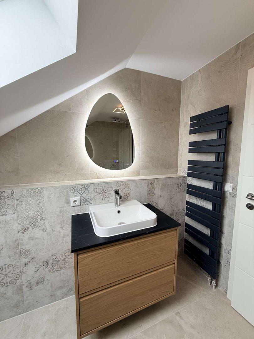Das stilvolle Badezimmer überzeugt mit großformatigen Fliesen, bodengleicher großer Dusche mit Glasabtrennung, Waschtisch mit Unterschrank und beleuchtetem Spiegel sowie Handtuchheizkörper.