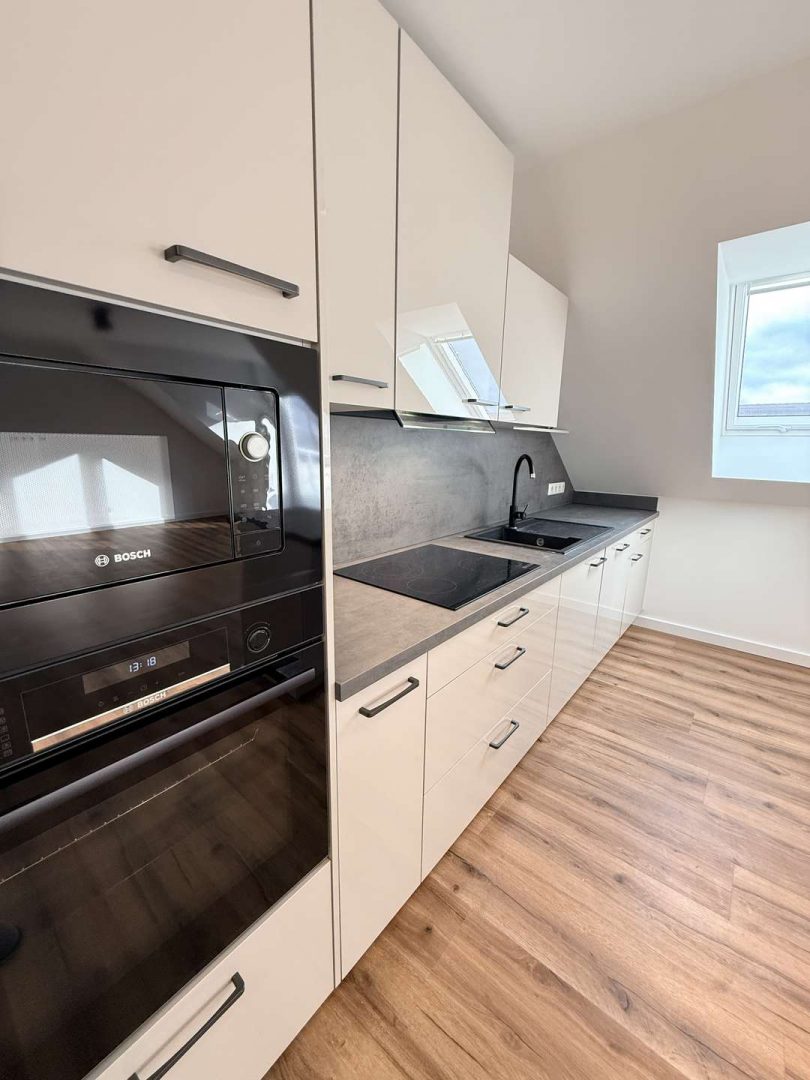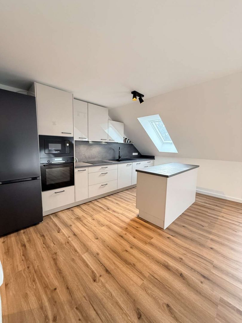 Die Ausstattung erfüllt hohe Ansprüche an Komfort und Qualität: neue Einbauküche mit Kochinsel, Einbaugeräte, Holzoptik-Bodenbelag, moderne Spotbeleuchtung, Dachflächenfenster, große Fensterfront mit Balkontür und elektrischen Rollläden sowie ein praktischer Abstellraum.