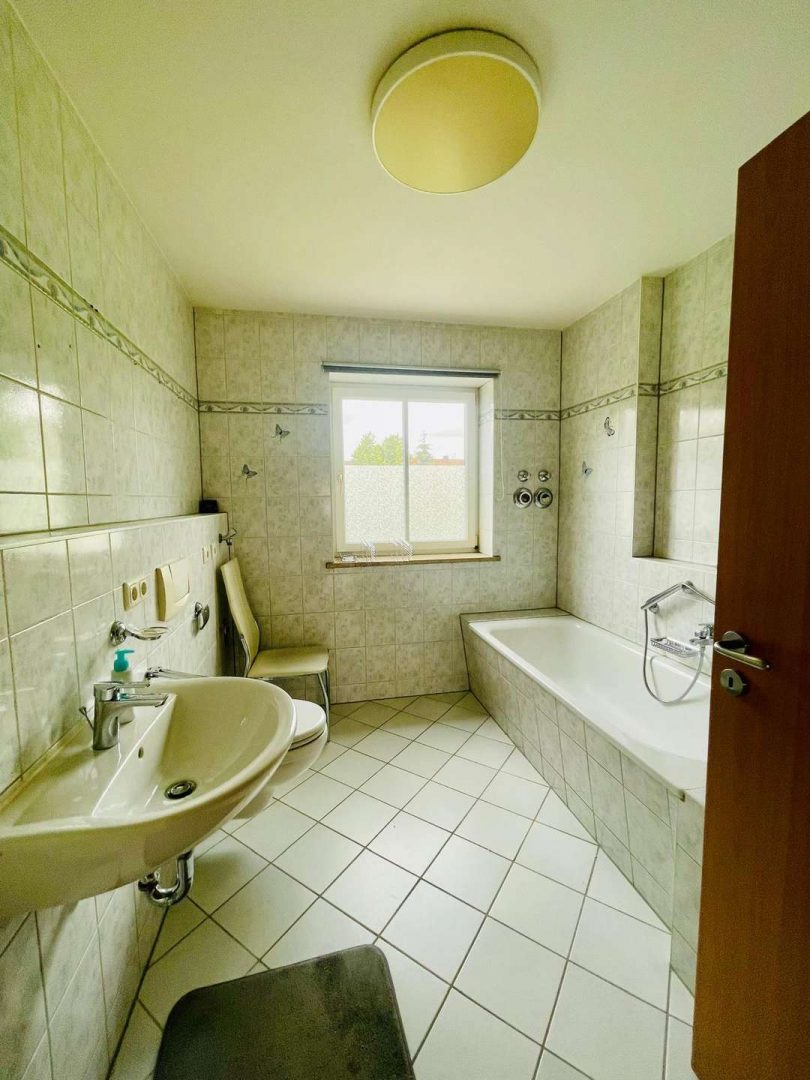 Badezimmer: Ein großes Bad mit Badewanne, Dusche, WC und Waschmaschinenanschluss.