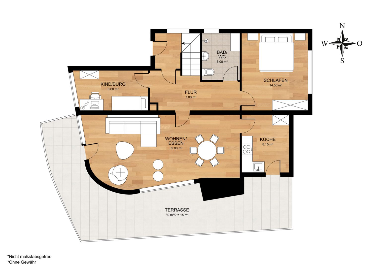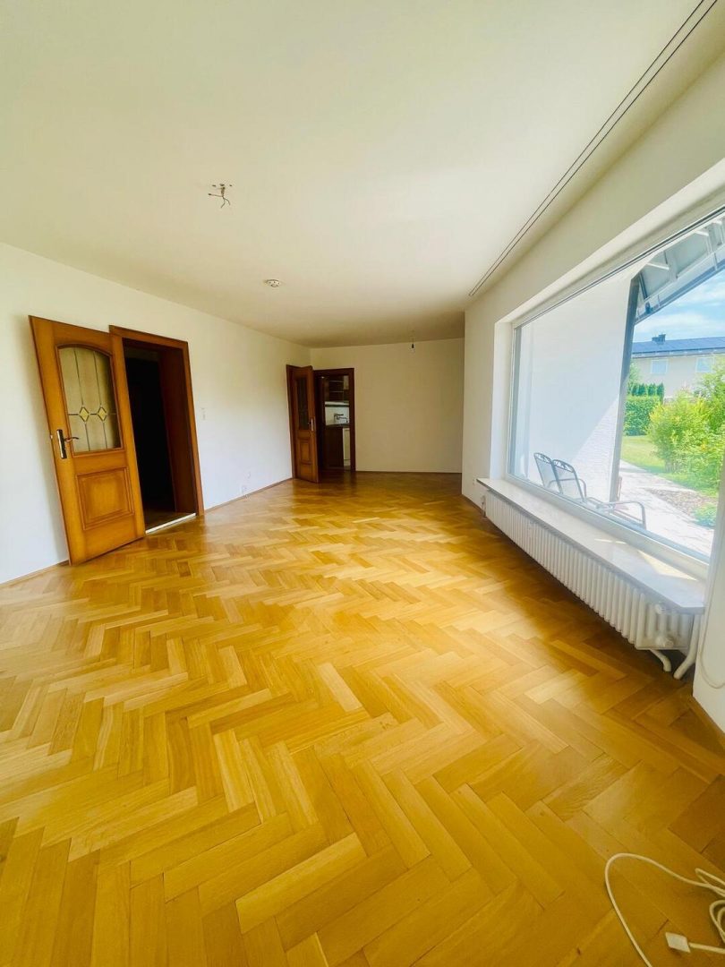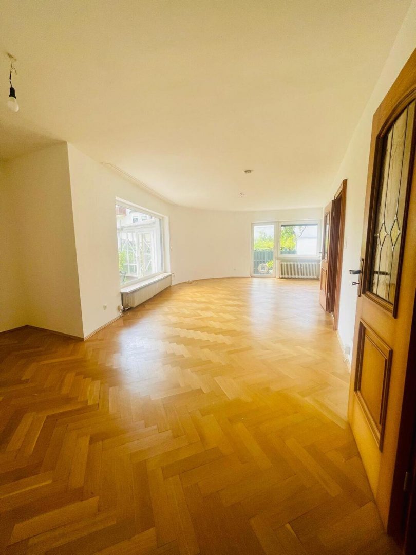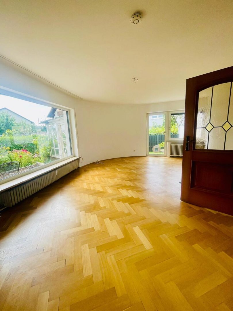Wohnzimmer: Direkt gegenüber vom Eingang liegt das großzügige, rund geschnittene Wohnzimmer. Es ist lichtdurchflutet und bietet Zugang zur Küche sowie zur Terrasse.