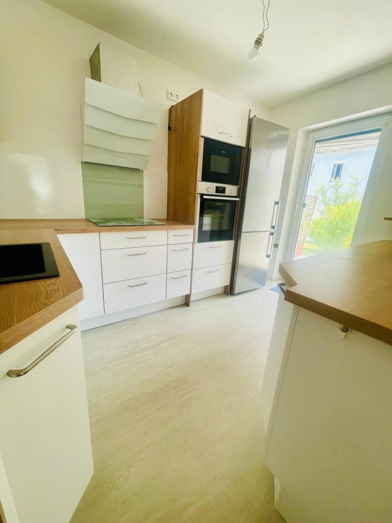 Küche: Die moderne Einbauküche schließt direkt an das Wohnzimmer an und bietet einen Zugang zur Terrasse.