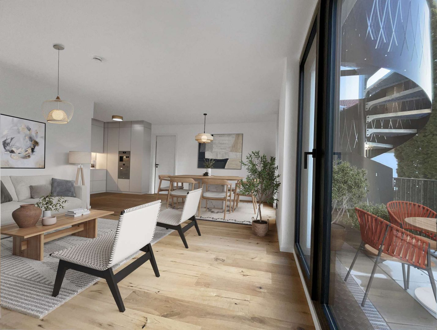 In den Wohnungen sorgt eine Fußbodenheizung für angenehme Wärme und Behaglichkeit. Hochwertige Holzfenster tragen zur Energieeffizienz bei und halten gleichzeitig die laufenden Kosten niedrig. Die stilvollen Außenwandleuchten sorgen für eine einladende und sichere Atmosphäre, die zu gemütlichen Abenden im Freien einlädt.